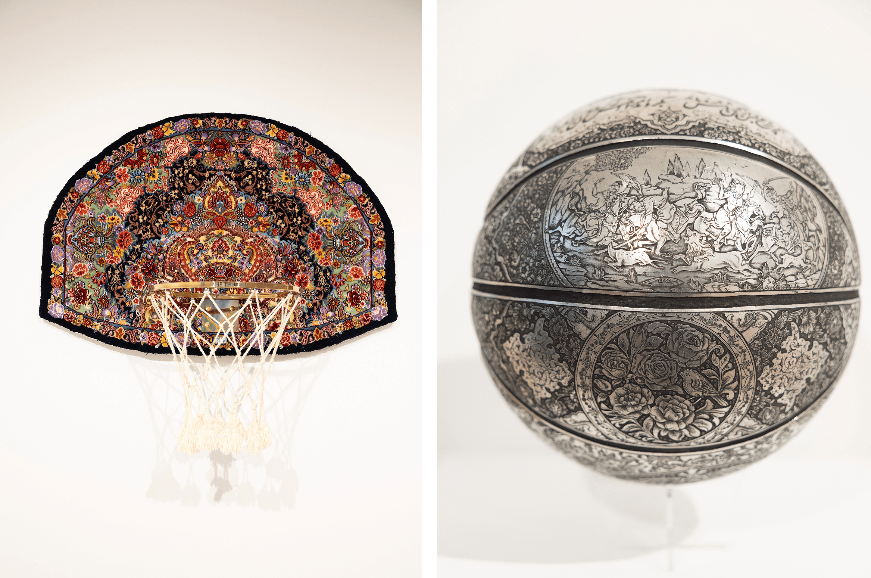 Une salle met en lumière les origines iraniennes de Jérémie Nassir, avec une installation signée Mohammad Jamshidi, joueur emblématique de l’équipe d’Iran. Les tapis posés au sol, issus de la famille de Jérémie, donnent un contexte supplémentaire à l’ensemble.
